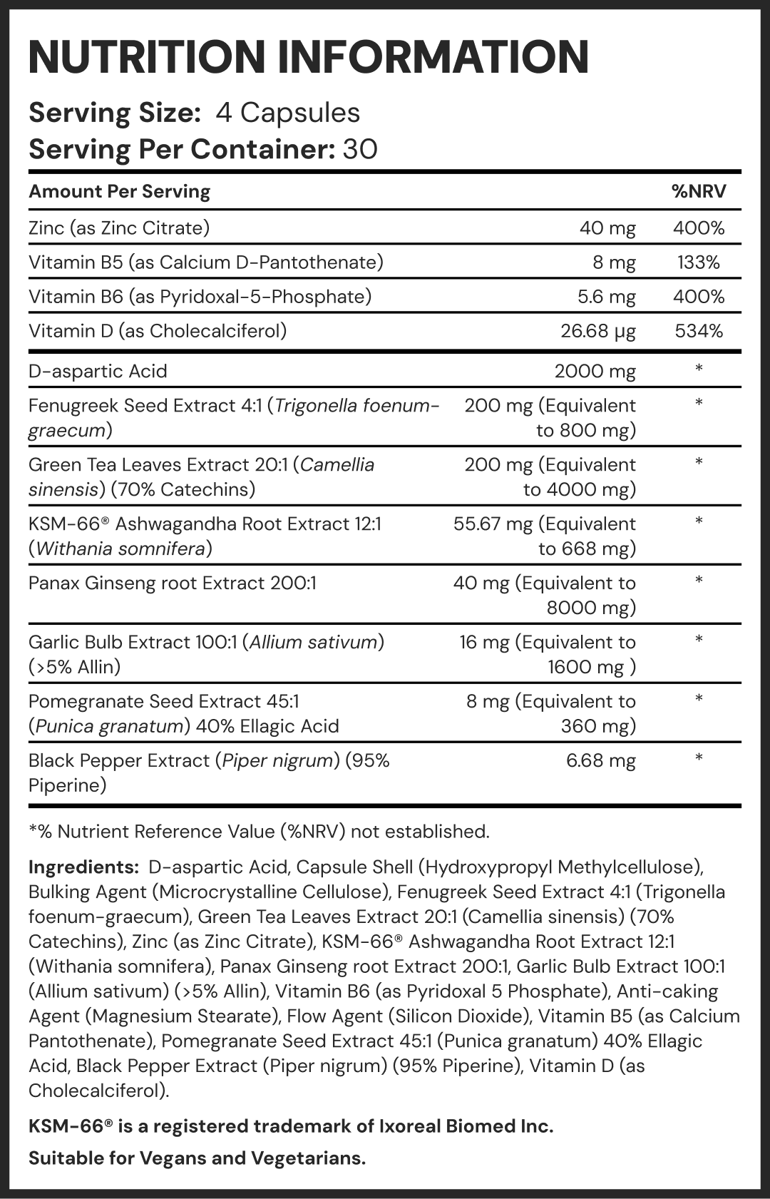 D-Aspartic AcidNaturally-occurring amino acid helps play a major role in supporting the production of the Luteinizing Hormone (LH).